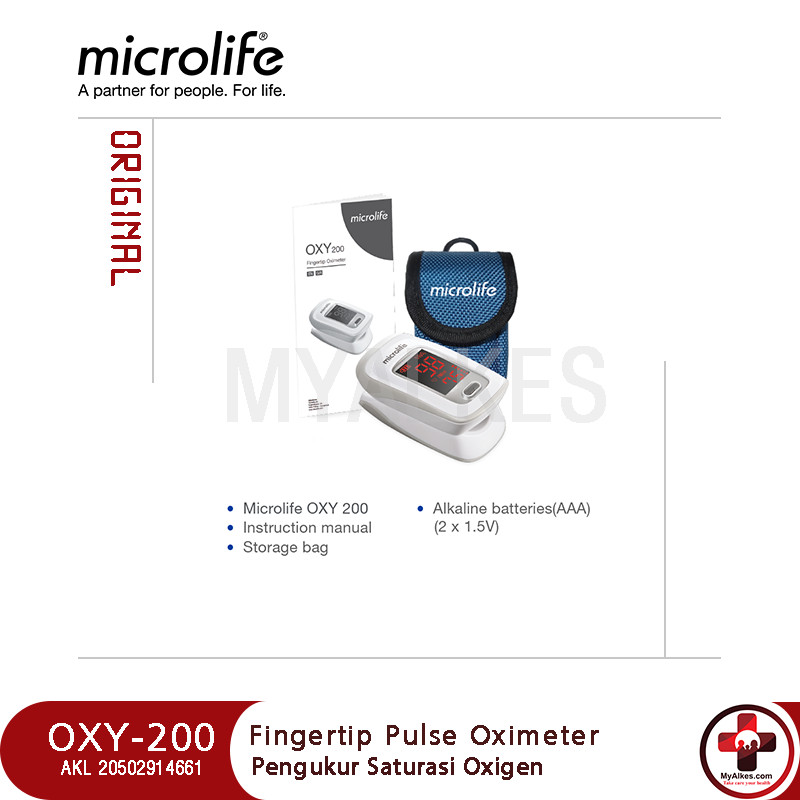 The oksimeter pulsa ujung jari Microlife OXY 200 adalah alat portabel non-invasif yang dimaksudkan untuk memeriksa-tempat saturasi oksigen dari hemoglobin arteri (SpO 2 ) dan laju denyut nadi orang dewasa dan pasien anak-anak. Sangat cocok untuk penggunaan pribadi (di rumah, atau saat bepergian) serta untuk digunakan dalam sektor medis (rumah sakit, fasilitas tipe rumah sakit).