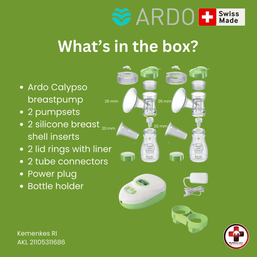 Produk terdiri dari : pompa ASI beserta mesin, power adapter, 26mm pelindung payudara, penahan botol.